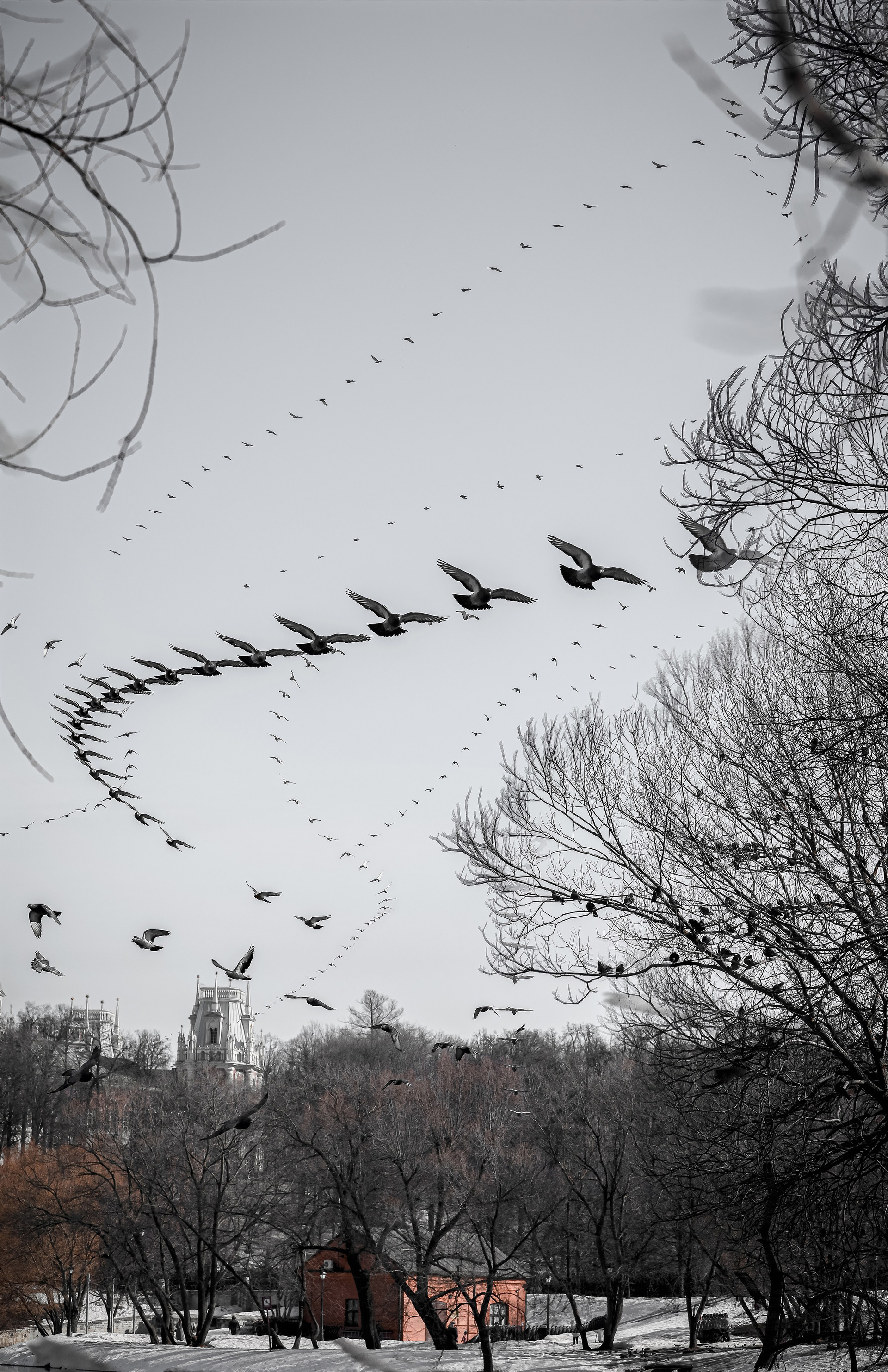 Движение в пространстве эфемерно — птицы пролетают, и их траектории исчезают в мгновение. Автор фиксирует эти мгновения, превращая мимолётное в вечное.
